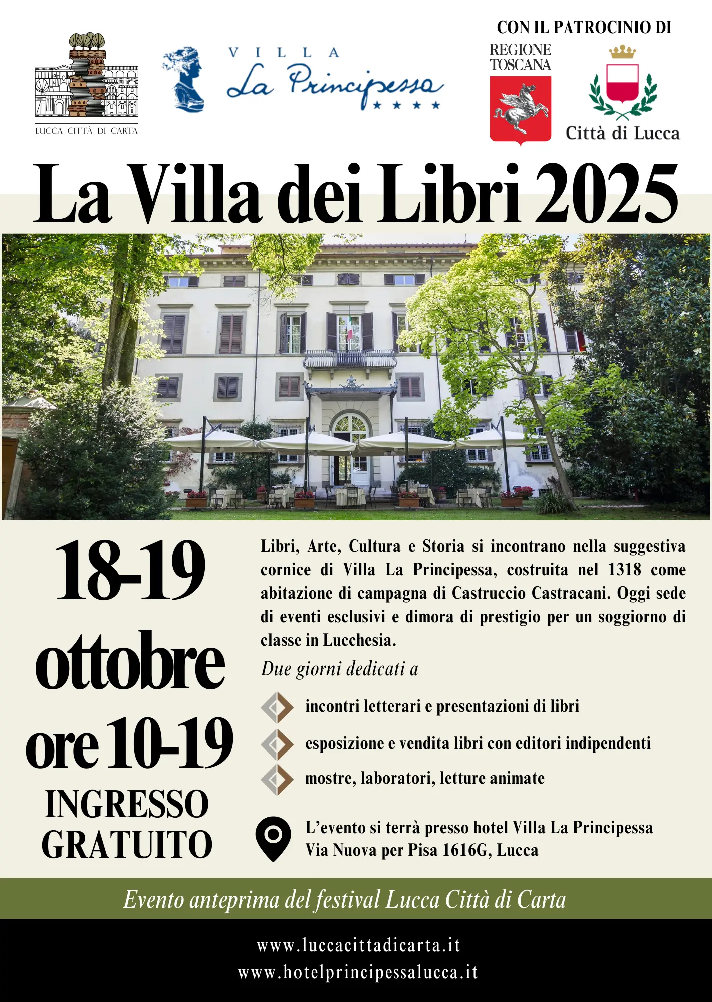 La rassegna letteraria “La Villa dei Libri” si terrà il 18 e 19 ottobre 2025 a Villa la Principessa a Lucca, come anteprima del Festival Lucca Città di Carta.